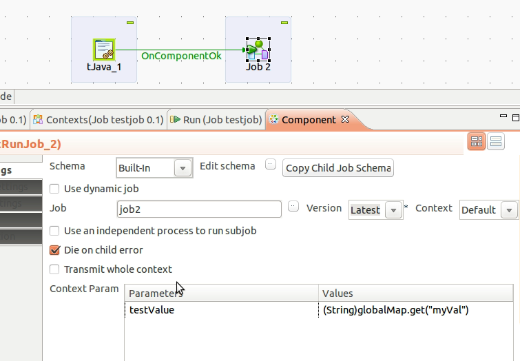 To access the above value in Job 2 , define this component’s properties as below. Note the “Context Param” definition, this is how we can set the value in the context variable and retrieve it in the child job.
